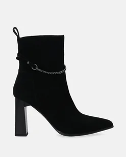 Czarne botki damskie wykonane ze skóry owczej typu zamsz. Elegancki krój z noskiem w szpic osadzony na malowanym, wysokim słupku. Prosta cholewka ozdobiona subtelnym dodatkiem w postaci łańcuszka. Stylowy model, który przypadnie do gustu niejednej kobiecie. malowany obcas nosek w szpic zapięcie na suwak wyściółka ocieplona krótkim, miękkim futerkiem ozdobny łańcuszek zamszowa szlufka