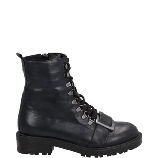Granatowe botki wykonane ze skóry cielęcej o gładkim licu. Zachwycają modnym, nowoczesnym designem. Masywna podeszwa zapewnia świetną stabilność i modny wygląd, nie wpływa na odczuwalny ciężar buta. Sznurowana cholewka została uzupełniona o suwak umieszczony po wewnętrznej stronie ułatwiający zakładanie buta. Doskonały akcent stanowi srebrna klamra.