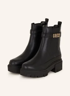 Materiał syntetyczny i tkanina. Metalowe detale w złotym kolorze. Pętelka ułatwiająca zakładanie przy cholewce. Boczny zamek błyskawiczny. Migdałowe noski. Obcas słupek. Antypoślizgowa podeszwa zewnętrzna. Markowe litery na pasku