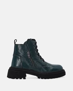 Lakierowane botki wykonane ze skóry cielęcej. Sznurowana, błyszcząca cholewka z praktycznym suwakiem z boku została wyróżniona tłoczeniem z modnym, zwierzęcym motywem. Lakierowane trzewiki świetnie wpisują się w aktualne trendy. sznurowanie pozwoli na dopasowanie tęgości zaokrąglone noski metalowe przelotki sznurówek ocieplana polarem wyściółka antypoślizgowa podeszwa z bieżnikiem ozdobny otok