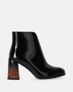Botki damskie wykonane z lakierowanej skóry naturalnej w głębokiej czerni. Gładka cholewka o minimalistycznym kroju została osadzona na szerokim, stabilnym obcasie ozdobionym wzorem w panterkę, który nadaje całości wyjątkowego charakteru. Zaokrąglony nosek i delikatne wykończenia podkreślają elegancki fason, a klasyczna forma połączona z efektownym detalem sprawia, że model doskonale sprawdzi się zarówno w codziennych, jak i wieczorowych stylizacjach. naturalna skóra lakierowana obcas typu słupek z motywem w panterkę suwak od wewnętrznej strony elastyczna wstawka na cholewce z motywem panterki