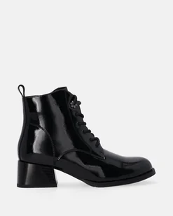 Czarne trzewiki wykonane z lakierowanej skóry naturalnej. Klasyczna, sznurowana cholewka wyposażona w dodatkowe zapięcie na suwak. Niewielki malowany obcas nadaje eleganckiego charakteru. Lakierowane trzewiki idealnie wpisują się w modowe trendy. sznurowanie oraz suwak wyściółka w całości ocieplana miękkim, krótkim futerkiem zaokrąglony nosek wygodny, szeroki obcas skórzana szlufka przeszywany otok