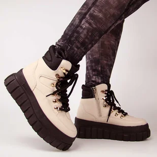 Płeć: Damskie, Kolor: Beżowy, Wysokość: Wysokie, Materiał: Skóra ekologiczna, Rodzaj zapięcia: Sznurowadła, Dodatkowe informacje: Ocieplane, Stan: Nowy