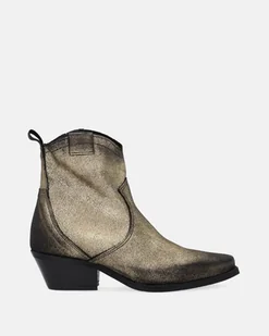 Zamszowe kowbojki wykonane z wysokiej jakości skóry bydlęcej. Model został wyróżniony metalicznym nadrukiem, który pięknie połyskuje w słońcu. Kowbojki to dodatek, który sprawdzi się zarówno do spodni, jak i sukienek. noski w szpic ścięty obcas zapięcie na krótki suwak metalizowana skóra charakterystyczne przeszycia skórzana wkładka i wyściółka z materiałem w części palców