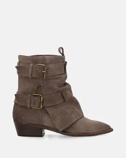Damskie botki z zamszu w odcieniu szarości to wyjątkowa propozycja dla kobiet poszukujących oryginalnych butów na co dzień. Model przyciąga wzrok przecieranym wykończeniem oraz warstwową, miękką cholewką ozdobioną szerokimi paskami z metalowymi klamrami w kolorze postarzanego złota. Wsuwana konstrukcja ułatwia szybkie zakładanie, a lekko uniesiony obcas podkreśla sylwetkę i zapewnia komfort podczas chodzenia. Skórzana podeszwa jest wytrzymała i dodaje całości charakteru w stylu vintage. szpiczaste noski przecierane wykończenie wsuwany fason bez zapięcia dwa paski z metalowymi klamrami miękka wa