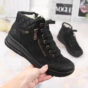 Wodoodporne skórzane botki ocieplane Rieker W RKR567 Właściwości: buty marki Rieker doskonałe na zimę dla kobiet wysoki model cholewka wykonana z wysokiej jakości materiałów ocieplona wyściółka zapinane na suwak i sznurowadła uniwersalna kolorystyka Kolor: czarny