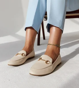 Beżowe mokasyny z klamerką Erminia to obuwie na czasie, które jest wsuwane i innowacyjne. Wykonane z tworzywa sztucznego, są niskie i idealne na letnie dni. ...
