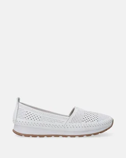 Damskie codzienne mokasyny wykonane ze skóry bydlęcej w białym kolorze. Precyzyjne perforacje w cholewce dbają o stałą cyrkulację powietrza, eliminując efekt przegrzewania. Dzięki elastycznej wstawce mokasyny łatwo wsunąć i zdjąć, a miękka, skórzana wkładka dopasowuje się do kształtu stopy. Lekka, gumowo podeszwa z subtelnym bieżnikiem zapewnia doskonałą przyczepność i elastyczność, a estetyczne przeszycia dodają modelowi wyjątkowego, rzemieślniczego charakteru. Idealne na co dzień do pracy, na spacer czy spotkanie w mieście.