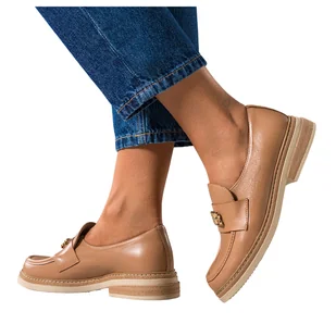 Camelowe mokasyny skórzane damskie ze złotą ozdobą PRODUKT POLSKI Casu 79825 Camelowe mokasyny skórzane damskie ze złotą ozdobą PRODUKT POLSKI Casu model 79825 to wyrafinowane połączenie ciepłego camelowego koloru, szlachetnej faktury skóry i subtelnego blasku detalu. Harmonijna linia, zaokrąglony nosek oraz pasek ze złotą ozdobą nadają całości ponadczasowy charakter, który od pierwszego spojrzenia buduje wrażenie elegancji i pewności stylu. Wnętrze zaprojektowano z myślą o komforcie na co dzień. Wysokogatunkowa skóra naturalna miękko dopasowuje się do stopy, a miękka wkładka ze skóry naturalnej zapewnia przyjemne podparcie nawet podczas długiego dnia. Płaska podeszwa z delikatnym 3 cm obcasem stabilizuje krok, oferując wygodę bez rezygnacji z kobiecej sylwetki i estetyki.