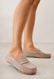 Ciemnobeżowe Ażurowe Mokasyny ze Skórzaną Wkładką Ozdobione Przeszyciami Sylilise