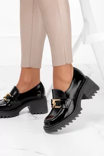 Czarne mokasyny skórzane damskie na szerokim słupku ze złotym łańcuchem PRODUK POLSKI Casu 20107-38
