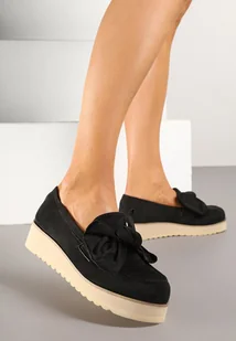 Czarne Mokasyny z Imitacji Zamszu na Grubej Podeszwie Zdobione Kokardką Nusadea