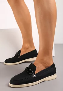 Czarne Mokasyny z Metalicznym Łańcuchem i Perforacją Mireali