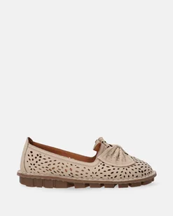 Damskie mokasyny wykonane z wysokiej jakości skóry cielęcej w beżowym kolorze z subtelnym ażurowym wzorem, który dodaje im lekkości i elegancji. Model zachwyca klasycznym krojem, wzbogaconym ozdobną kokardą, nadającą butom kobiecego wdzięku. Wnętrze wykończone miękką, skórzaną wkładką gwarantuje komfort noszenia przez cały dzień. ażurowy wzór biały przeszywany otok miękka, skórzana wkładka uniwersalny kolor ozdobna kokarda