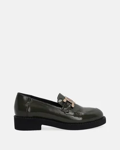 Mokasyny damskie wykonane z lakierowanej skóry cielęcej w kolorze zielonym. Klasyczny model, który doskonale odnajdzie się w stylizacjach od codziennych po biznesowe. lakierowana skóra złota ozdoba w części śródstopia skórzana wyściółka zaokrąglone, przeszywane noski lekka podeszwa z bieżnikiem usztywniony zapiętek