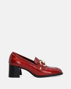 Czerwone mokasyny wykonane z lakierowanej skóry cielęcej. Zgrabna cholewka została urozmaicona dekoracyjną, złotą klamrą. Ciekawym rozwiązaniem jest dodatkowa ozdoba w formie skórzanego paska. Lakierowane mokasyny na obcasie będą uniwersalnym dodatkiem do każdej stylizacji. szeroki stabilny obcas dodatkowa, dopinana ozdoba noski z charakterystycznym przeszyciem skórzana wyściółka dodatki w złotym kolorze usztywniany zapiętek