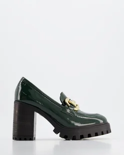 Mokasyny damskie wykonane z lakierowanej skóry w kolorze zielonym. Gruba gumowa podeszwa oraz masywny obcas to modne dodatki w nadchodzącym sezonie. ozdoba w postaci złotej klamry zaokrąglony nosek z charakterystycznym przeszyciem podeszwa z bieżnikiem subtelny otok skórzana wyściółka oraz wkładka