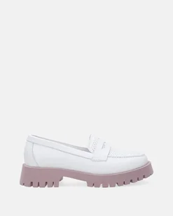 Mokasyny damskie wykonane z miękkiej skóry cielęcej w kolorze białym. Minimalistyczna cholewka została przełamana podeszwą z bieżnikiem w kontrastującym kolorze. Mokasyny idealnie sprawdzą się w codziennym użytkowaniuzaokrąglony nosek z przeszyciem ażurowy wzór skórzana wyściółka lekka podeszwa modne i wygodne