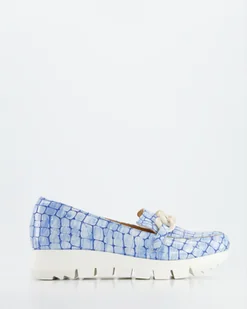 Mokasyny damskie wykonane ze skóry cielęcej lakierowanej. Prezentują nowoczesny, bardzo komfortowy krój. Model z charakterystycznym przeszyciem na noskach. Ozdobę stanowi biały łańcuch na cholewce. Masywna ale jednocześnie bardzo elastyczna podeszwa zapewnia świetną stabilność oraz nadaje oryginalny, "ciężki" wygląd.