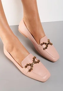 Mokasyny Artaleia na płaskim obcasie i cienkiej podeszwie. Eleganckie, urozmaicone modnym, kwadratowym noskiem. Model wsuwany. Wykonane z ekoskóry. Ozdobione pozłacaną ozdobą w kształcie łańcuszka.