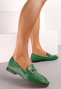 Zielone Klasyczne Mokasyny z Kwadratowym Noskiem na Płaskim Obcasie Ozdobione Klamrą Aldreda
