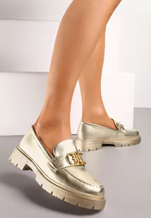Złote Eleganckie Mokasyny Ozdobione Klamerką i Przeszyciem z Przodu Nastra