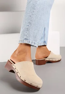 Beżowe Klapki Typu Drewniaki z Nitami i Płaskim Obcasem Nerai