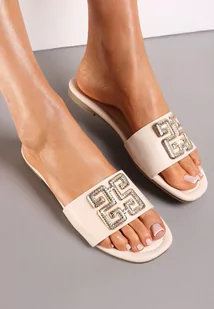 Beżowe Klapki z Metalową Ozdobą z Cyrkoniami Helenthea