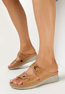 Brązowe Klapki na Grubej Podeszwie z Ozdobnymi Paskami i Odkrytym Noskiem Diophne