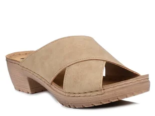 Klapki damskie typu chodaki marki Inblu. Cholewki wykonane ze skóry ekologicznej w kolorze beżowym. Skórzana, miękka wkładka. Przeszycia cholewki i podeszwy ...