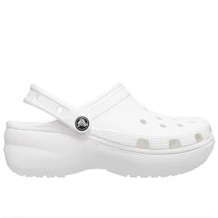 Klapki damskie Crocs Classic Platform Clog 206750-100 – białe Klasyczne chodaki na platformie Crocs z serii Classic Platform Clog. Model tego obuwia w odróżnieniu od klasycznej wersji wyposażono w podwyższoną platformę, która nadaje większego szyku. Buty posiadają komfortową konstrukcję z szerokimi wkładkami i tylnym paskiem, który przyjemnie otula piętę. Dzięki wentylacyjnym otworkom buty są przewiewne i zapewniają utrzymanie odpowiedniej temperatury. Model w całości zostały wykonane z materiału Croslite, który jest niezwykle lekki, co sprawia, że buty są jeszcze wygodniejsze.
