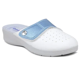 Biało-niebieskie klapki medyczne marki Inblu. Otwory w cholewce pozwalają stopom oddychać. Wkładka wykonana ze skóry naturalnej z systemem Comfort Anatomico ...
