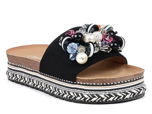 Czarne klapki damskie na platformie to niezwykle modny wybór na lato. Te czarne klapki S.Barski z pewnością przyciągną uwagę swoją biżuteryjną ozdobą na chol...