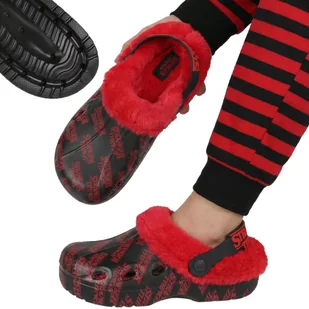 Stranger Things OCIEPLANE klapki damskie, chodaki z futerkiem, CIEPŁE obuwie domowe 38 EU Damskie chodaki z licencjonowanym motywem Stranger Things to połączenie modnego designu i maksymalnego komfortu noszenia w domowych warunkach. Wnętrze obuwia zostało wykończone niezwykle miękkim, puszystym futerkiem w intensywnym czerwonym kolorze, które skutecznie ogrzewa stopy nawet w chłodne dni. Lekka, ergonomiczna konstrukcja sprawia, że klapki są wygodne podczas codziennego użytkowania, zarówno rano, jak i wieczorem. Regulowany pasek na pięcie umożliwia stabilne dopasowanie oraz noszenie w dwóch wariantach – jako klasyczne klapki lub zabudowane chodaki. Czarno-czerwona kolorystyka z powtarzalnym logo serialu nadaje im charakteru i czyni je idealnym wyborem dla fanek stylowych dodatków inspirowanych popkulturą.