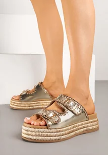 Złote Klapki na Grubej Plecionej Podeszwie z Szydełkowym Wzorem Tenavira