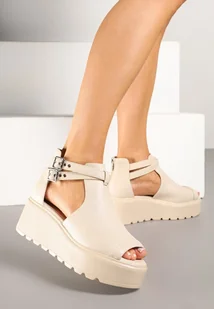 Beżowe Sandały na Koturnie ze Skórzaną Wkładką i Geometryczną Cholewką Sopessa