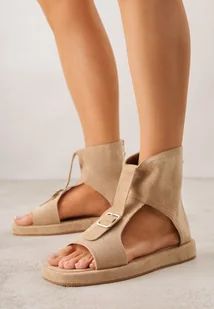 Ciemnobeżowe Sandały Typu Botki Ozdobione Metaliczną Klamrą z Przodu Adrasaia