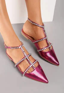 Sandały Basala wykonane z lakierowanej ekoskóry z metalicznym efektem. Na cienkiej podeszwie i płaskim obcasie. Nosek zabudowany, o eleganckim, szpiczastym kształcie. W przedniej części paski wysadzane kryształkami imitujące cyrkonie. Zapinane na sprzączkę.