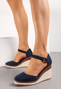 Granatowe Sandały na Koturnie z Plecionki i Zapięciem na Sprzączkę Jessaln