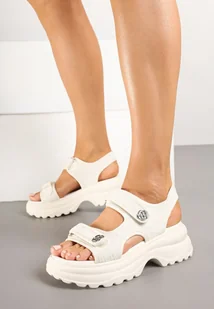 Jasnobeżowe Sandały na Grubej Podeszwie z Tweedowym Wzorem i Guzikami Senalen