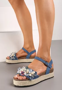 Niebieskie Sandały na Grubej Podeszwie Zapinane na Sprzączkę Ozdobione Koralikami Estalea