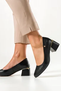 Czarne czółenka skórzane damskie na ozdobnym klocku złota ozdoba Casu SL24X2-B-36