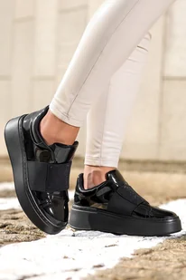 Czarne półbuty damskie lakierowane na platformie guma z cyrkoniami Casu JW24X14-B-36