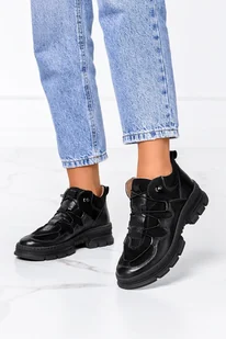 Czarne półbuty skórzane damskie lakierowane z gumą na platformie PRODUKT POLSKI Casu DS-667-NO