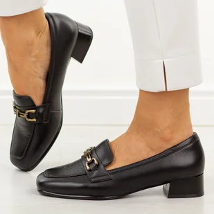 o fasonie inspirowanym mokasynami to idealna propozycja na wiosnę i jesień. Cholewka wykonana z wysokiej jakości skóry naturalnej prezentuje się elegancko i jest łatwa w pielęgnacji. Klamerka stanowi efektowną ozdobę, która dodaje modelowi szyku i podkreśla jego klasyczny charakter. Wsuwana konstrukcja zapewnia wygodę użytkowania, a miękka skórzana wkładka zwiększa komfort nawet podczas dłuższego noszenia. Kwadratowy nosek gwarantuje swobodę palcom, natomiast stabilny obcas delikatnie unosi sylwetkę i dodaje kobiecości.