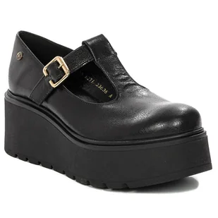 Maciejka Półbuty damskie skórzane czarne Wygodne półbuty damskie renomowanej, polskiej marki MACIEJKA. Materiał cholewki to wysokiej jakości skóra naturalna licowa w kolorze białym i czarnym z przecierką. Miękka wkładka oraz wnętrze także zostały wykonane ze skóry naturalnej i zapewniają naszym stopom niebywały komfort podczas chodzenia. Przód buta zdobi elegancki skórzany pasek z zapięciem na sprzączkę. Podeszwa z wysokogatunkowego tworzywa to masywna platforma w kolorze czarnym z obcasem 6.
