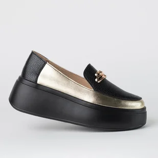 Mokasyny damskie skóra GOODIN GD-LX1073 platforma lekkie czarno/złote 37 Mokasyny damskie skórzane – Elegancja i wygoda w jednym Mokasyny damskie wykonane z najwyższej jakości naturalnej skóry to propozycja dla kobiet ceniących elegancję oraz komfort w każdym kroku. Cholewka wykonana z połączenia naturalnej skóry licowej i lakierowanej w połączeniu ze złotym logo nadaje butom subtelnej klasy, a grubsza, wyprofilowana i amortyzująca podeszwa zapewnia doskonałą wygodę przez cały dzień. Cechy produktu: Cholewka z naturalnej skóry – miękka, trwała i przyjemna w dotyku, podkreślający elegancki look. Złote logo – elegancki detal, który podkreśla luksusowy charakter obuwia.