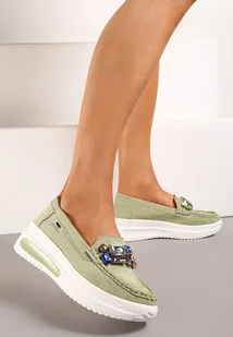 Zielone Mokasyny na Niskiej Platformie z Obszytym Przodem i Kryształkami Keelana