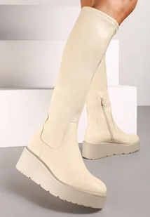 Beżowe Basicowe Kozaki na Grubej Podeszwie z Okrągłym Noskiem Tirisza