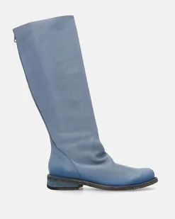 Niebieskie kozaki damskie wykonane z wysokiej jakości naturalnej skóry o subtelnym, cieniowanym wykończeniu. Smukła cholewka podkreśla elegancką linię modelu, a ozdobne marszczenie na podbiciu nadaje całości wyrazistego charakteru. Model wyposażony w suwak umieszczony z tyłu cholewki, który ułatwia zakładanie i zdejmowanie obuwia. Zaokrąglone noski nadają klasyczny wygląd, a skórzana wkładka zwiększa komfort codziennego użytkowania. Przeszywany otok podkreśla staranność wykonania oraz trwałość konstrukcji.